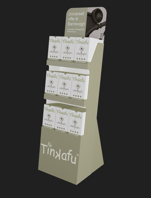 Bestiller du én eske svarte Tinkafu®-vifter (40 stk), får du med et display som rommer 27 enheter – helt uten ekstra kostnad. Displayet er utformet for å tiltrekke oppmerksomhet i butikk og gjøre det enkelt for kundene å ta med seg en vifte.