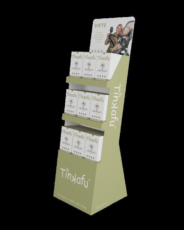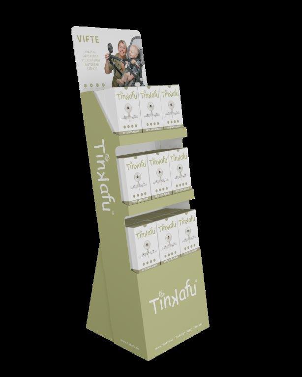 Et lekkert og funksjonelt display som fremhever Tinkafu-viften på en ryddig og inspirerende måte i butikk. Displayet er utviklet spesielt for butikker og har plass til 27 vifter, med tydelig profilering som skaper oppmerksomhet og mersalg i sesong. Ved andre sesonger så kan vifter erstattes med andre Tinkafu-produkter.